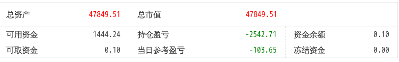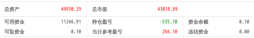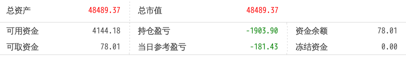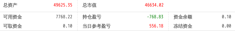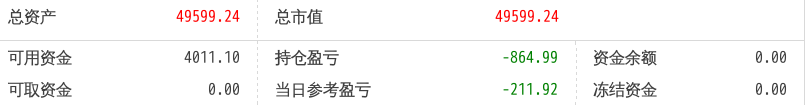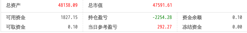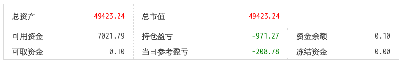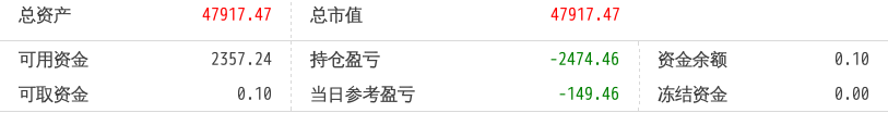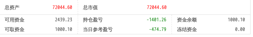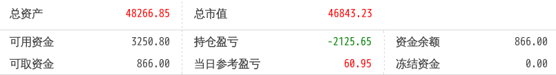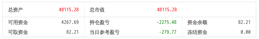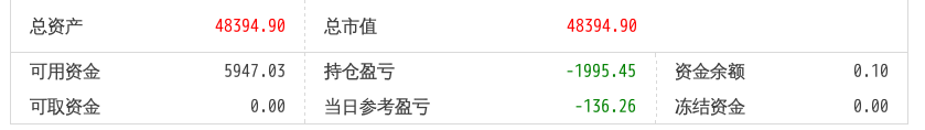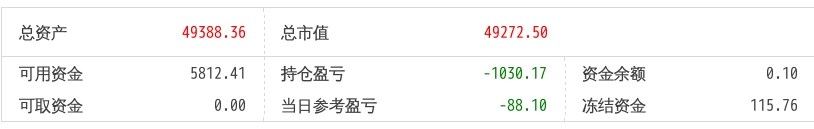 220512总资产87868.88 总市值87868.88 可用资金2137.21 持仓盈亏-8093.62 当日参考盈亏-143.76