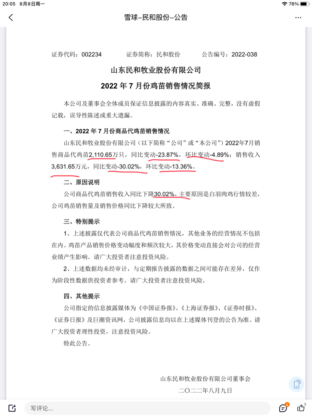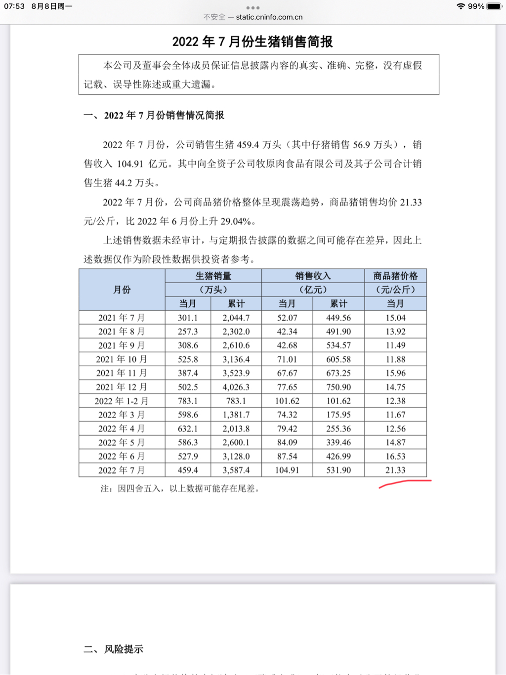2022 年 1-7 月,公司累计销售生猪 76.77 万头,累计销售收入 90,756.59 万元,分别比去年同期增长 50.71%、-28.97%。