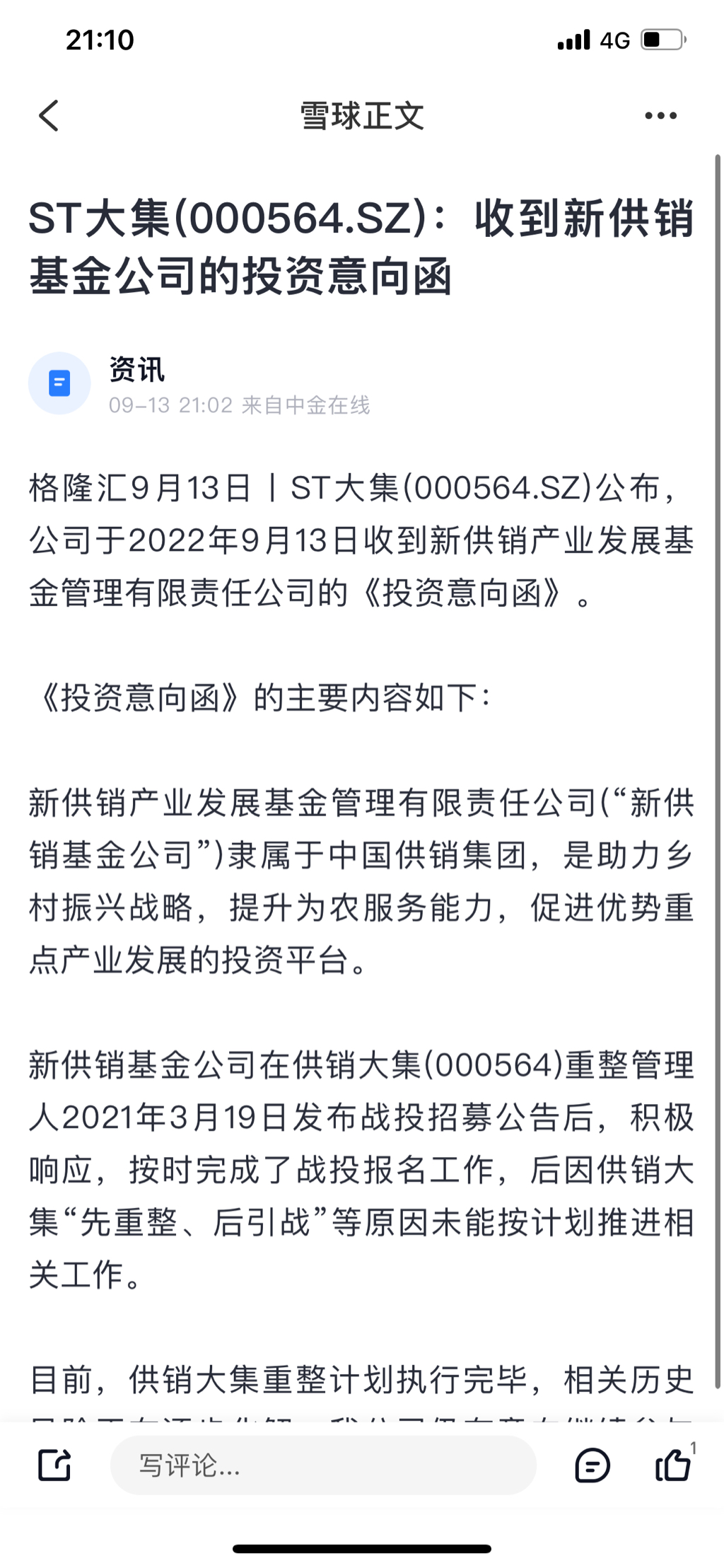 ST大集出来后,第一天天地板,第二天继续跌停,雪球上一片幸灾乐祸之声。两天时间没了一辆小汽车,心里是很受挫的。可理智的来说,之前的炒作确实疯狂,整个11月拉出了疯狂的曲线,调整是应该的。远期来看,有几个题材可以展望,国企改革收官之年,预计有望在12月进行战投,然后摘帽,这是2个可以确定的好消息。同搜于特。
