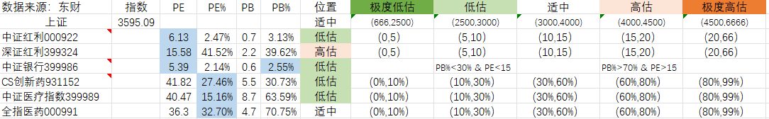 如图所示,就是我自己设置的判断目前位置的具体逻辑和思路。包括今天最新的数据。在我这医疗行业就是低估和适中位置的。我主要看医疗器械和创新药。我之所以自己买,不买指数,是因为我要做门票啊!