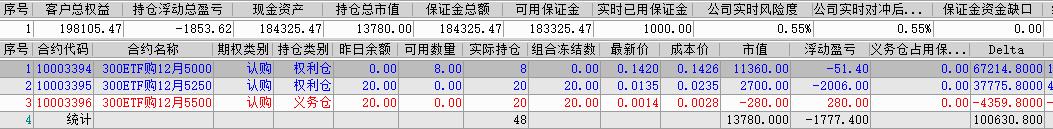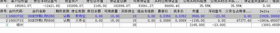 请教控制delta,控制到什么范围,最近我一直控制delta在-1.0到-3.0之间。一直保持相当于仓位负50万到150万。兄台呢?我是控制在-10到-30之间,我主要做的是50ETF。因为有很多虚值实值平直混在一起,所以仓位比较混乱,目前波动率处于低位了,我就不会新增加资金了,目前我的theta大概是2000元左右,我现在看持仓就是看delta,波动率和theta,卖沽卖的比较谨慎点,现在就是大跌升波,所以多卖点购问题不大。我卖实值的是因为我喜欢在交割日检点便宜,看有没冤大头忘记行权或者集合竞价的时候有没大幅折价的。