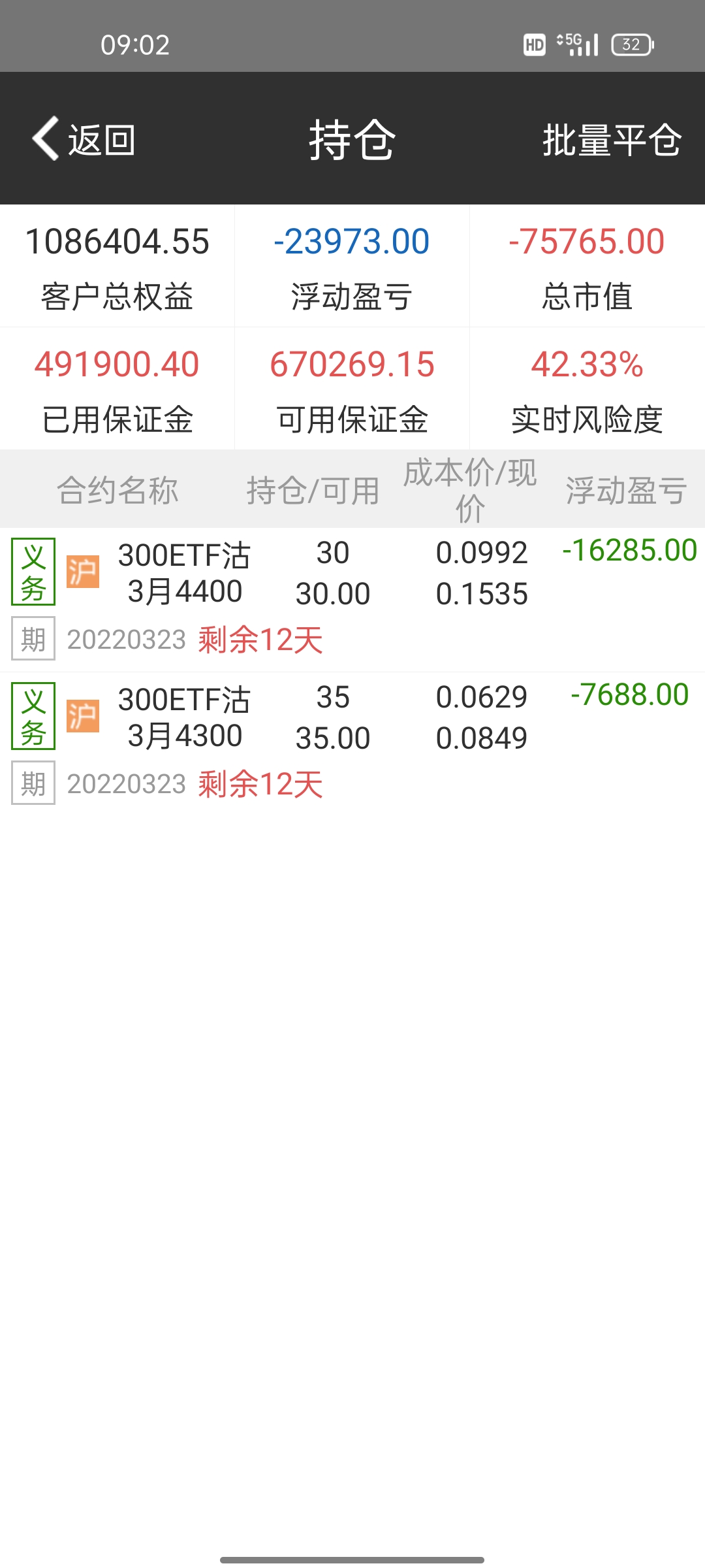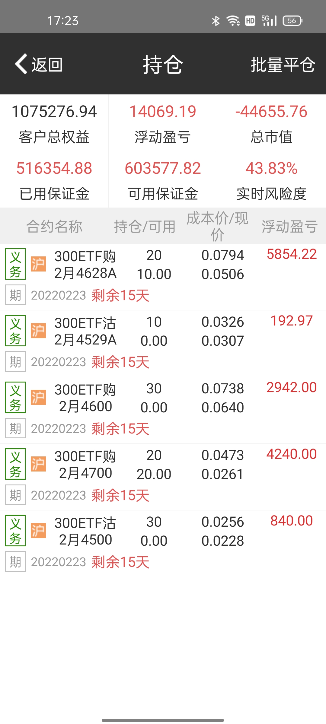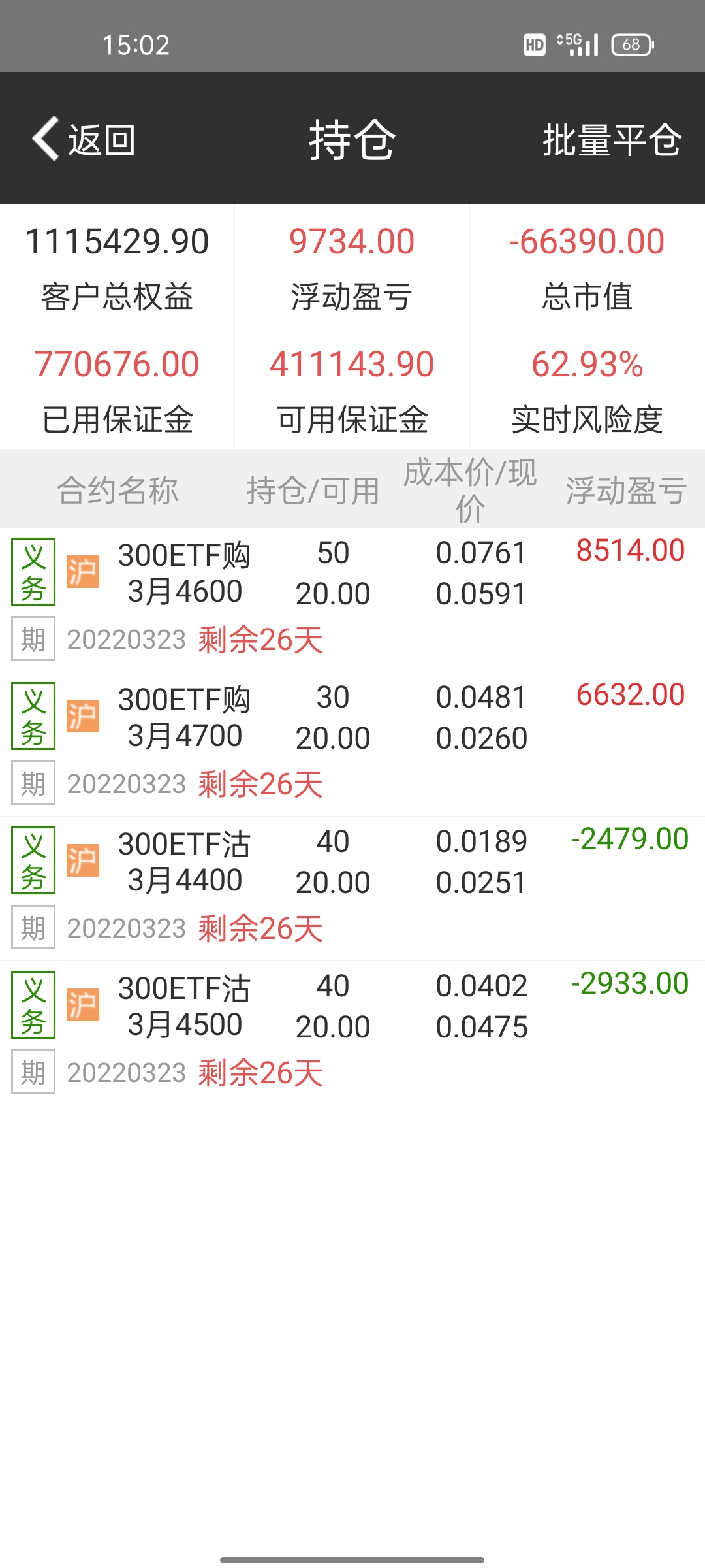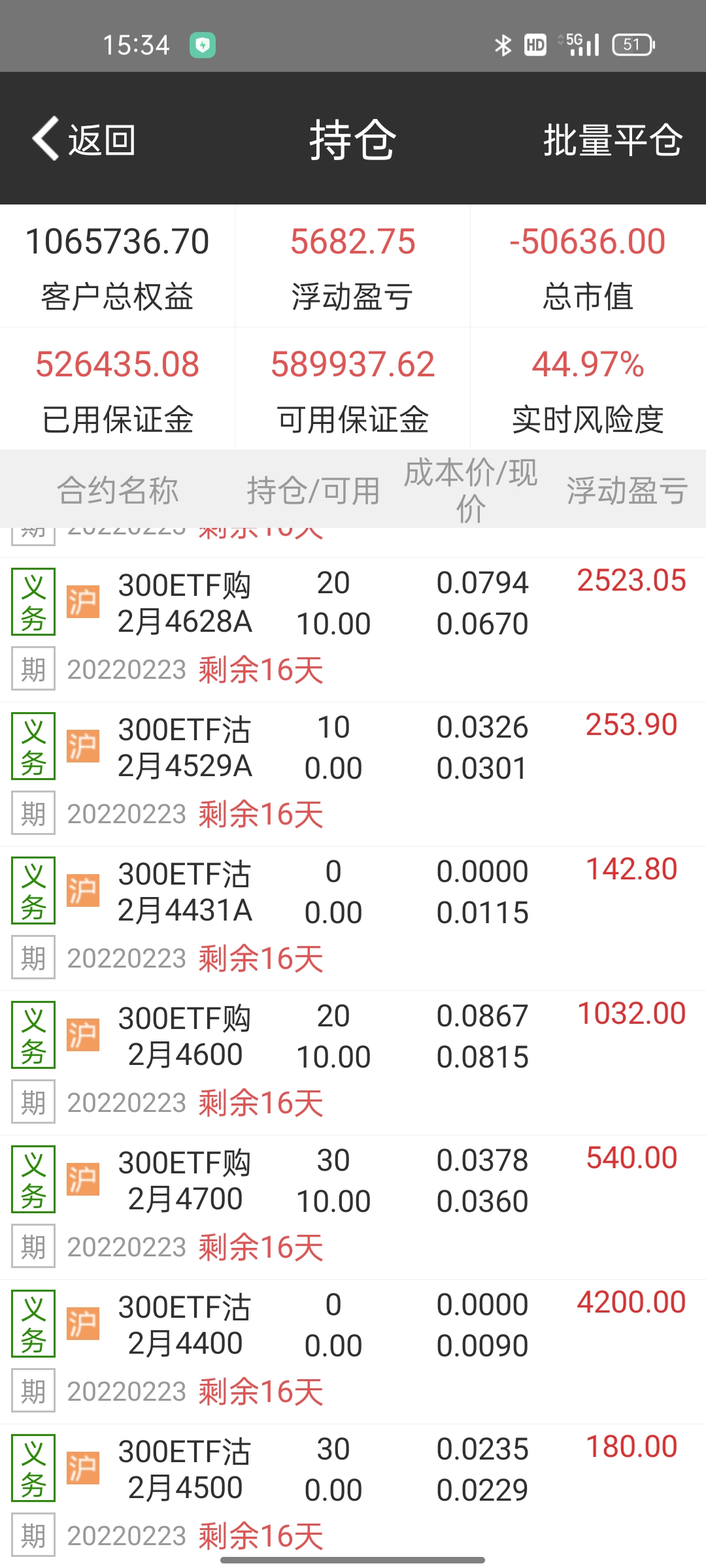 我现在的仓位是卖比例跨,初始比例2比1,既卖2张购加1张沽。最近跌的太多了调整比例为3比2,希望反弹后继续调整2比1比例。