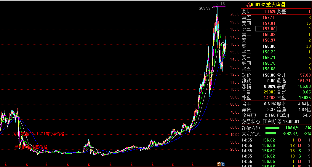 事实上重庆啤酒的跌停直到第10个交易日28.25元才打开,没几天又跌到20元出头,但很快传出徐翔”精准抄底“的故事,股价又最多反弹了近一倍。但是公司基本面走坏了,之后几年始终低迷,即便是2015年的大行情也不过30元出头。
