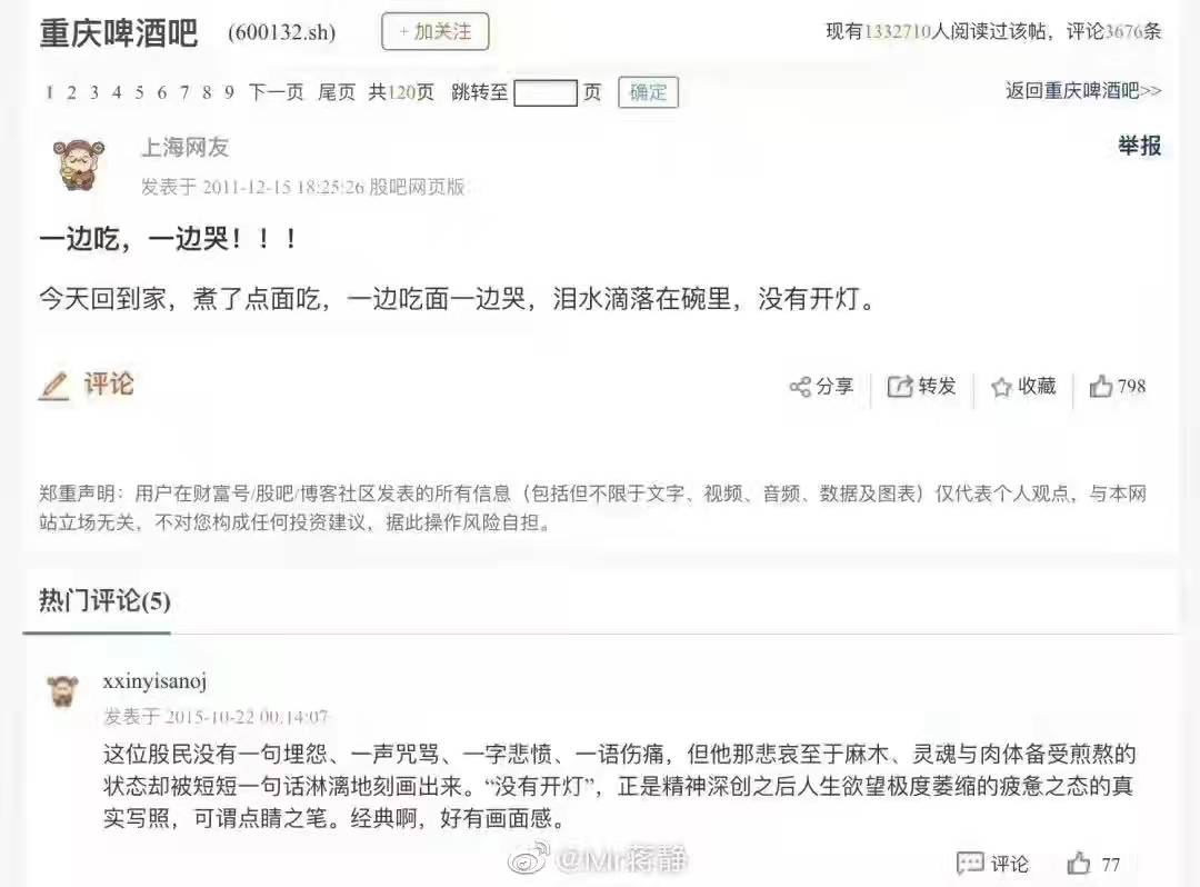 原来这是十年前重庆啤酒疫苗研制失败、连续10个跌停的第6个,股价跌到43.07元时某位网友留言。想来他当时的悔恨、难过,以及对未来的惶恐会长久萦绕心头。