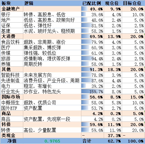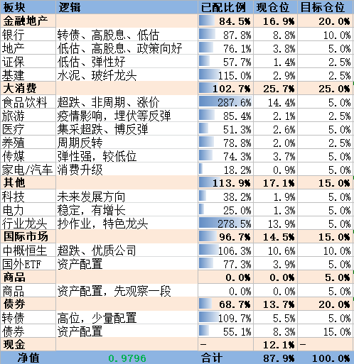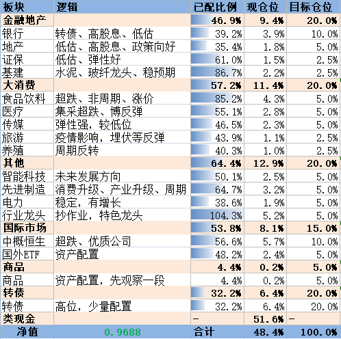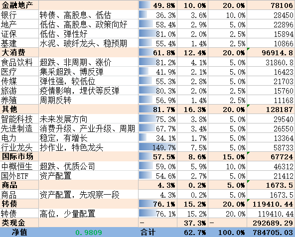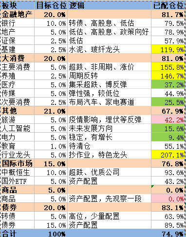 按照昨天的思路调整了下表格,家电/汽车合并,传媒目标仓位5%,其他几个2.5%的视情况不断调整。