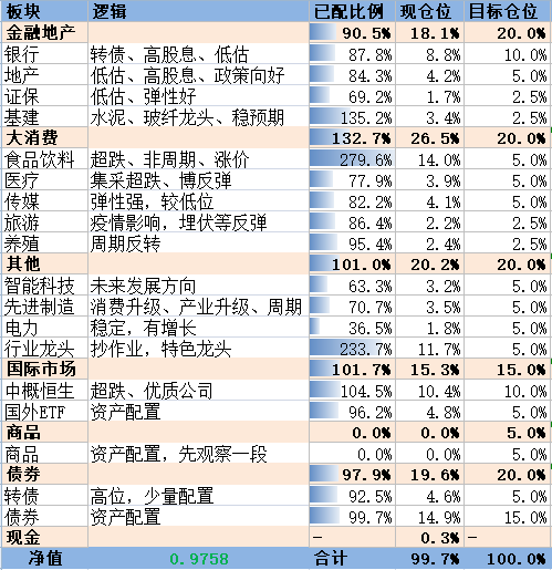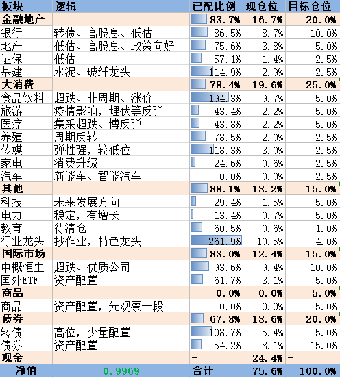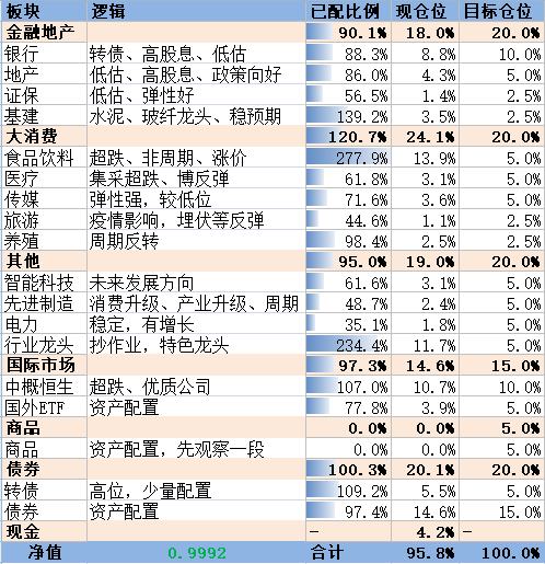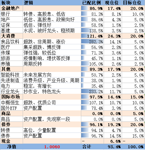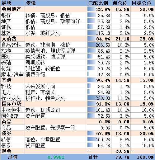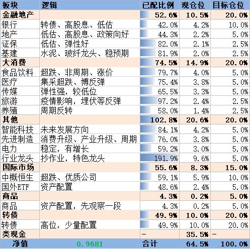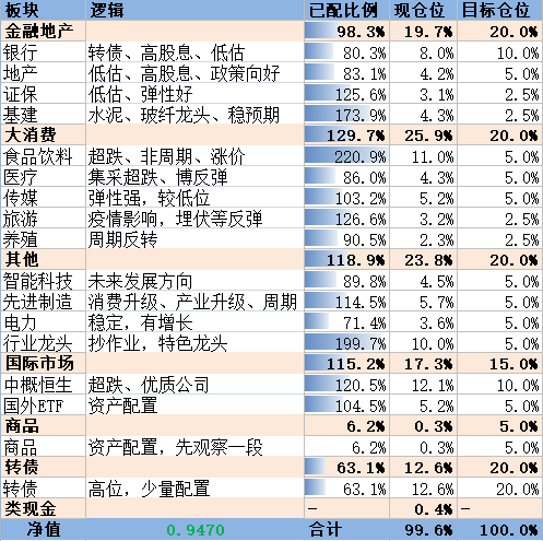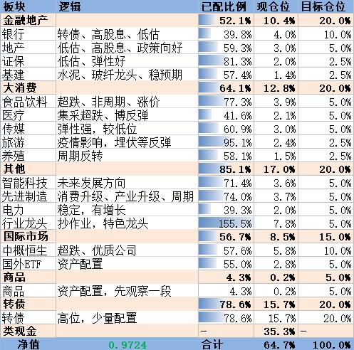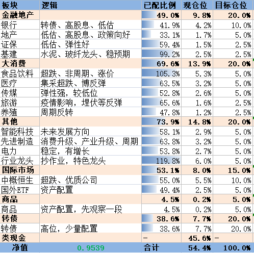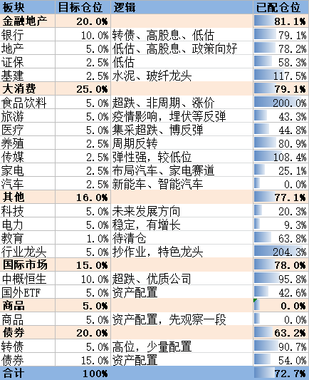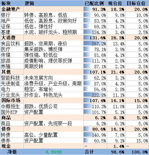 现在主要消费和行业龙头板块已经超配,进行减仓,重点加仓旅游交运(旅游ETF、深圳机场)、公用事业(电力ETF、川投能源)、人工智能ETF;其次少量加仓银行(光大、邮储)、地产(新城控股)、证保ETF、传媒(分众、中南)、商品和外国ETF,等机会慢慢加仓
