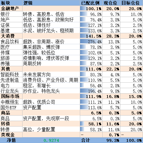 周末又对自己的配置方案进行了梳理,发现某些板块划分是有问题的,例如主要消费里其实是包含养殖的,所以将这块换成食品饮料了,另外旅游应该属于大消费板块,也进行了调整。今后的板块划分,应该尽量做到同板块的标的要有代表性,要有同涨同跌的属性,否则不应归到一起,不同板块间要尽量避免同涨同跌;通过这些天的观察,认识到自己选的股票真的没有比ETF走的好到哪里去,看来还是要尽量少买正股。