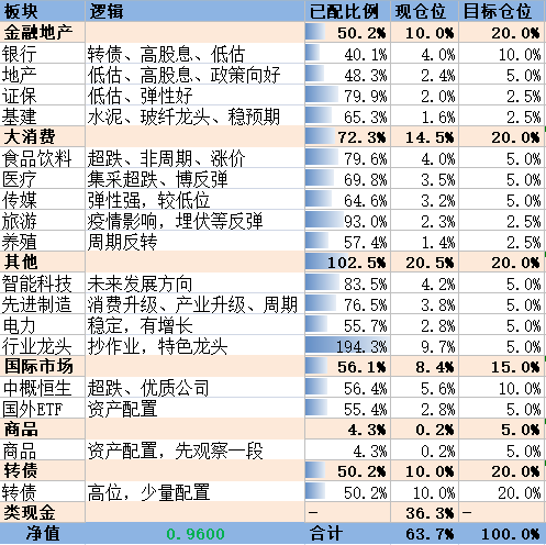 目前主要消费、养殖和抄作业的行业龙头配置的太多了,要减减仓,但方案制定好之后这两天一直在跌,而且现金还有挺多,也就没减仓。