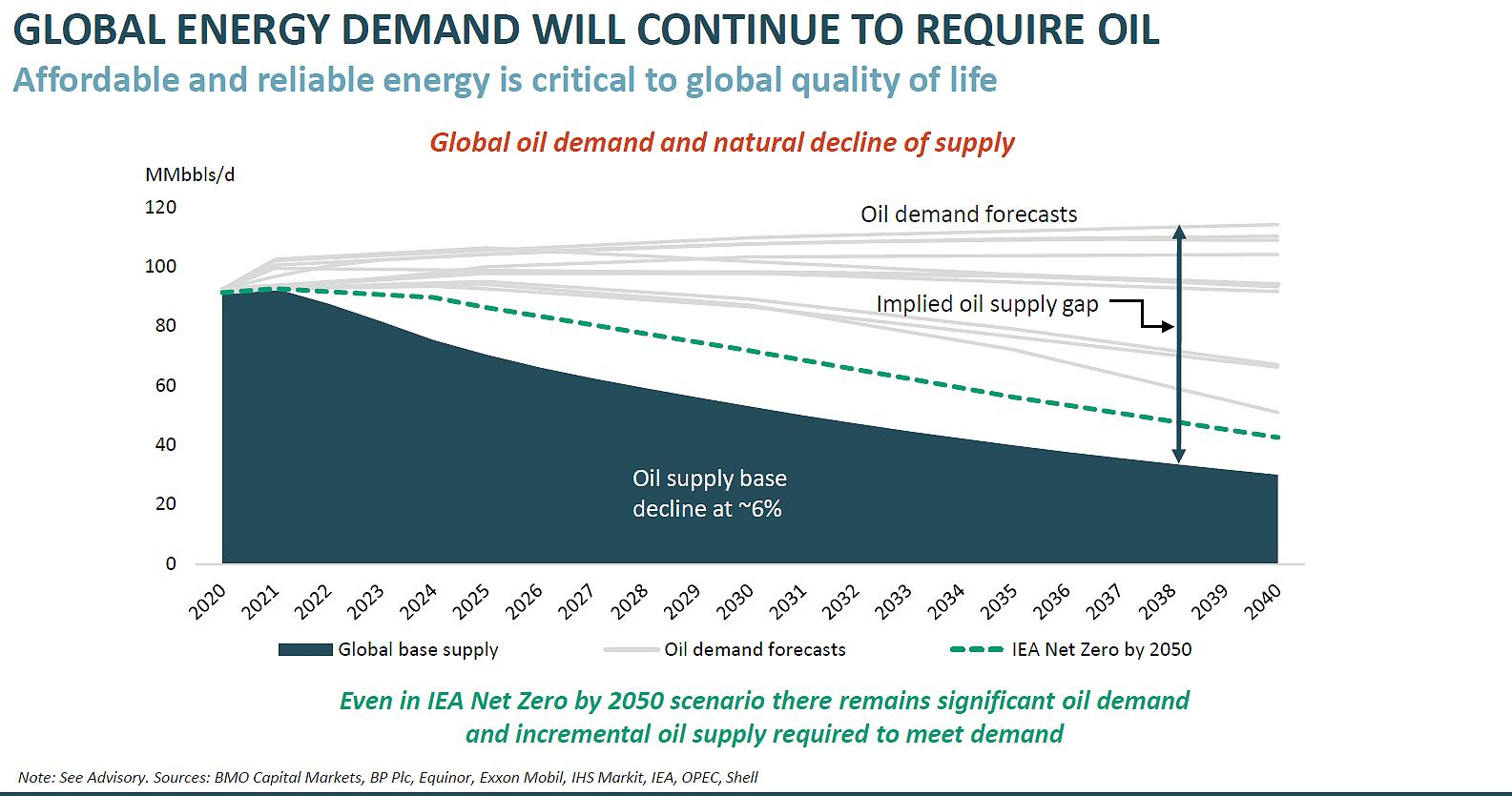 全球石油的供求预测见图。绿线是考虑到碳中和的石油需求,而实际的需求可能会更高。