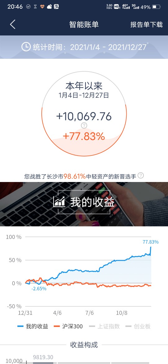 2021年继续定投,目前账面本金67W,股票盈利2.2W(就是中了个新股),基金亏损16K.全年不盈利不亏损。