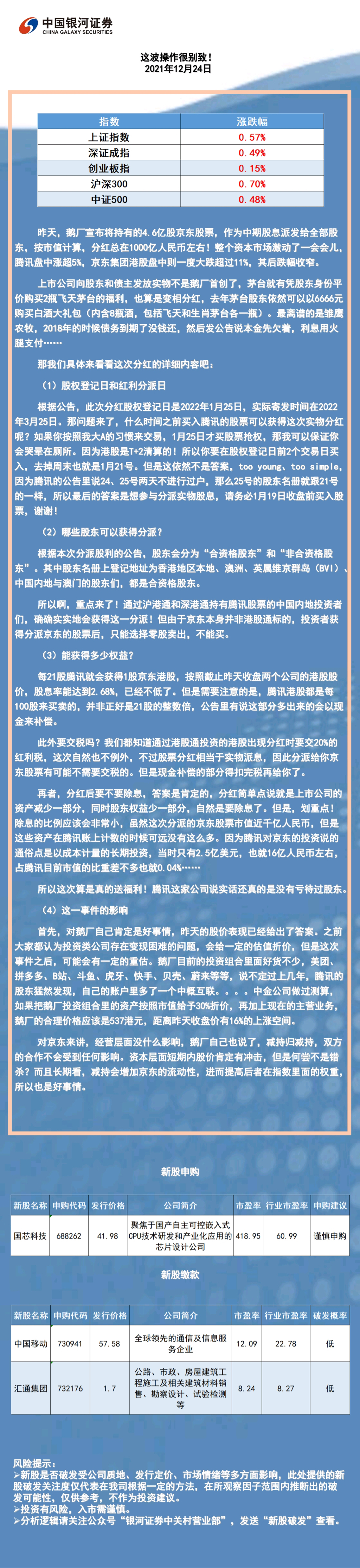 腾讯控股在港交所公告,董事会宣布,于2021年12月23日,决议将按合资格股东持有每21股股份获发1股京东集团A类普通股的基准,向于记录日期名列本公司股东名册 上之股东按彼等当时各自于本公司之持股比例,以实物分派的方式宣派由本公司 通过Huang River间接持有的457,326,671股京东集团A类普通股(假设自本公告日期至记录日期已发行股份总数并无变化)的特别中期股息,该等京东集团股份数目将被舍去零碎部份下调至最接近之整数。非合资格股东将无权收取京东集团股份,但将按于记录日期就所持有的每21股股份获发1股京东集团A类普通股的基准就彼等持有的股份收取现金代替京东集团股份。
