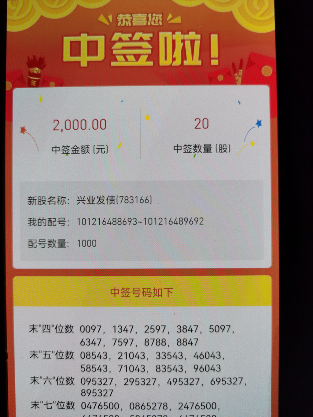@东方龙2014 总有人是那2%吧。就像隆22转债,网上申购中签率23%多,我三个账号一个都没中(平均四或者5中一),有朋友一个账号就中了两签