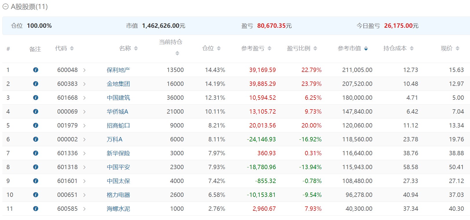 按公司市值从大到小排序,我持有平安,太保,万科,格力,海螺,中建,保利,新华,招蛇,金地,华侨城,公司市值大的比小的安全些,国企比私企安全些,万一公司出问题暴雷了,爆就爆吧,最差情况是亏光退市