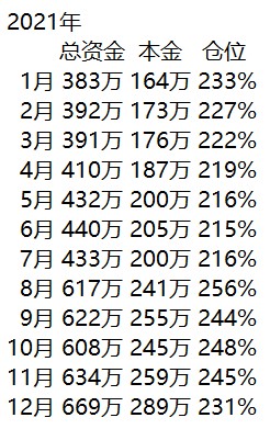 股市从去年下半年至今一直是缓慢震荡上涨,和2016,2017年的走势很像,有点慢牛的意思,全年收益百分比是71.3%,金额是120万,全年持仓一直保持200%以上仓位,有多一半收益是通过杠杆获得的,使用杠杆6年,保持100%以上高杠杆4年,杠杆对收益的提升效果明显,下图记录的是每个月结束时的数据