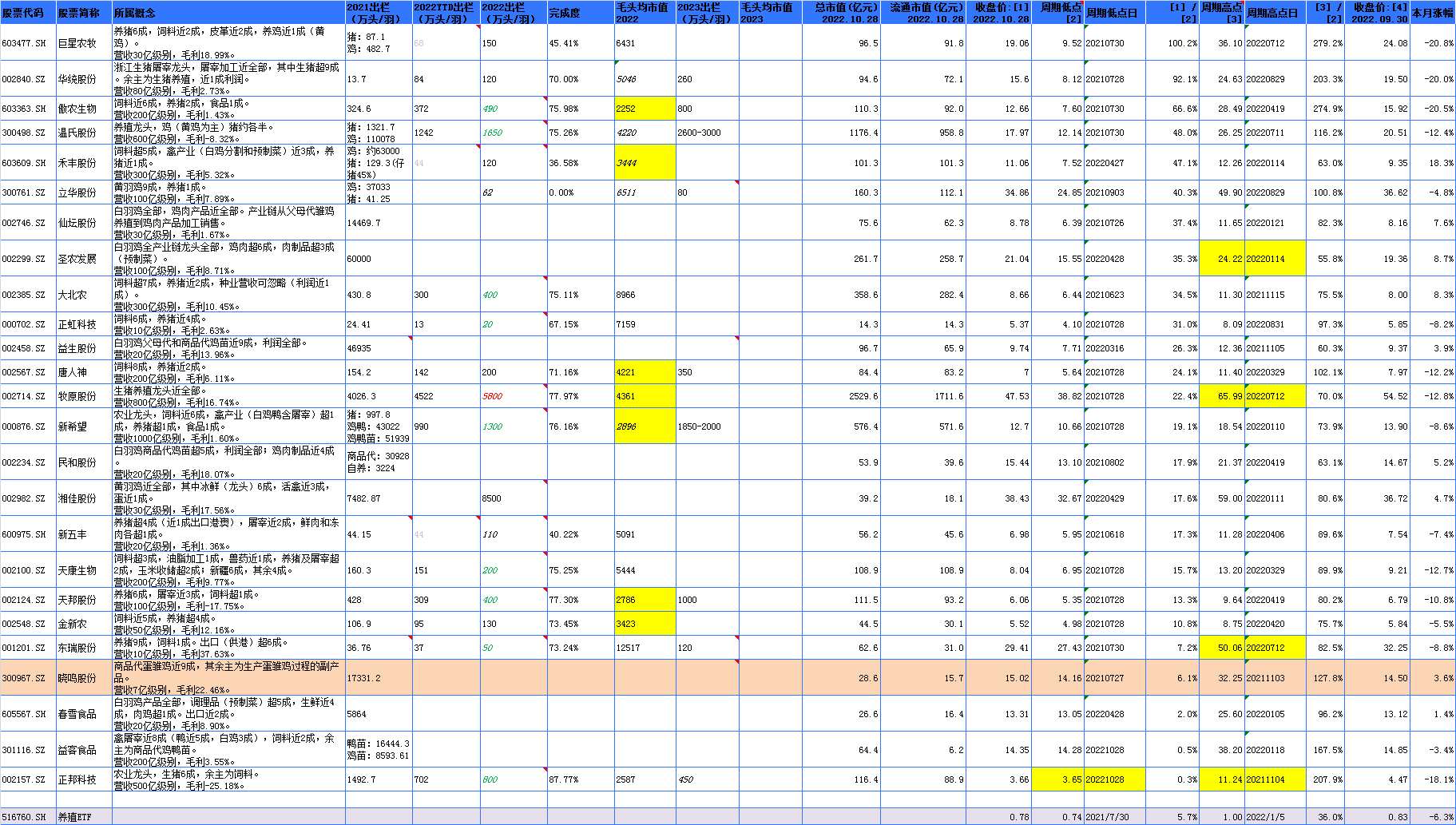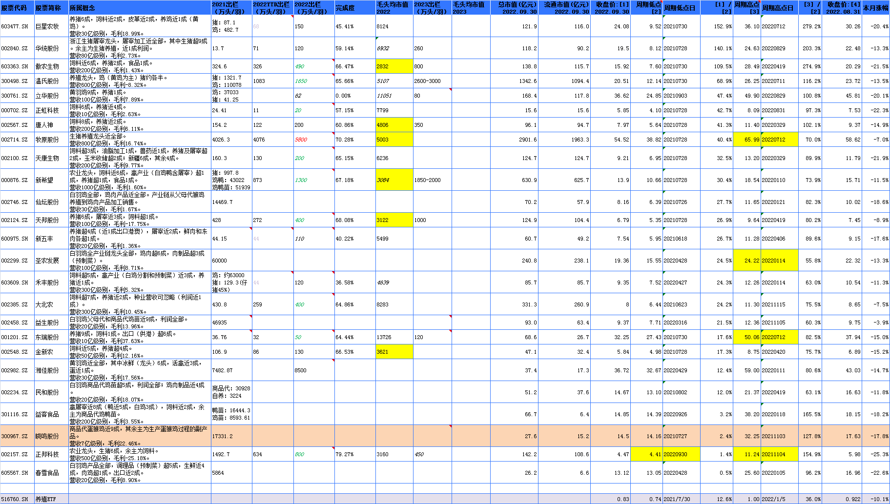 ----现在有15个比本轮周期低点才高了30%以内(而且有7个=近一半在今年三四月创了周期新低):等于再说,即使这轮周期已经结束,跌幅也就是30%以内,因为鸡猪上市公司的成长性,鸡猪周期每轮的低点都高于上轮低点,除非像正邦这种在这轮周期中摇摇欲坠而被迫减产能到低于之前一轮周期的