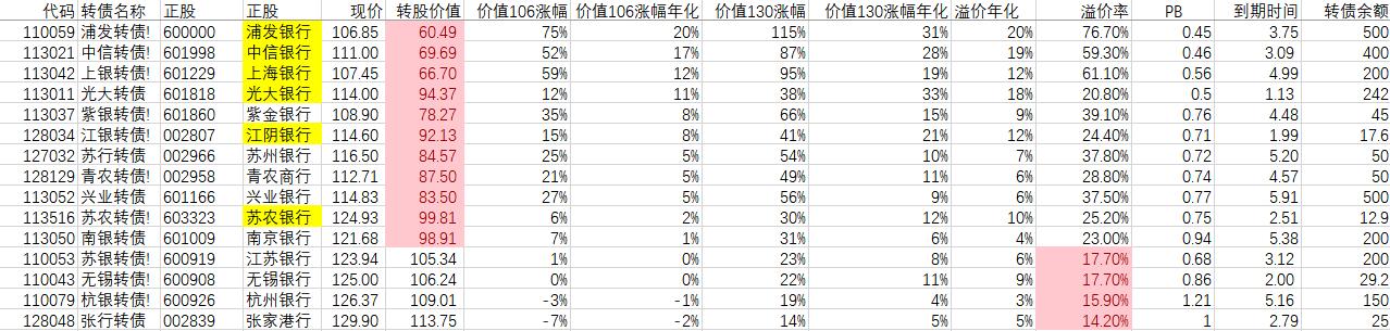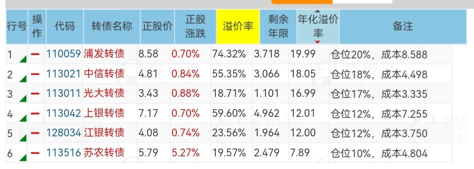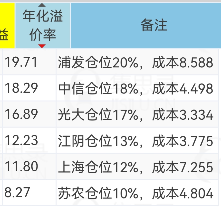 今天苏农银行按年溢价率指标进行一进一出,成本降到4.804元;浦发银行加到满格20%仓位,成本8.588元。