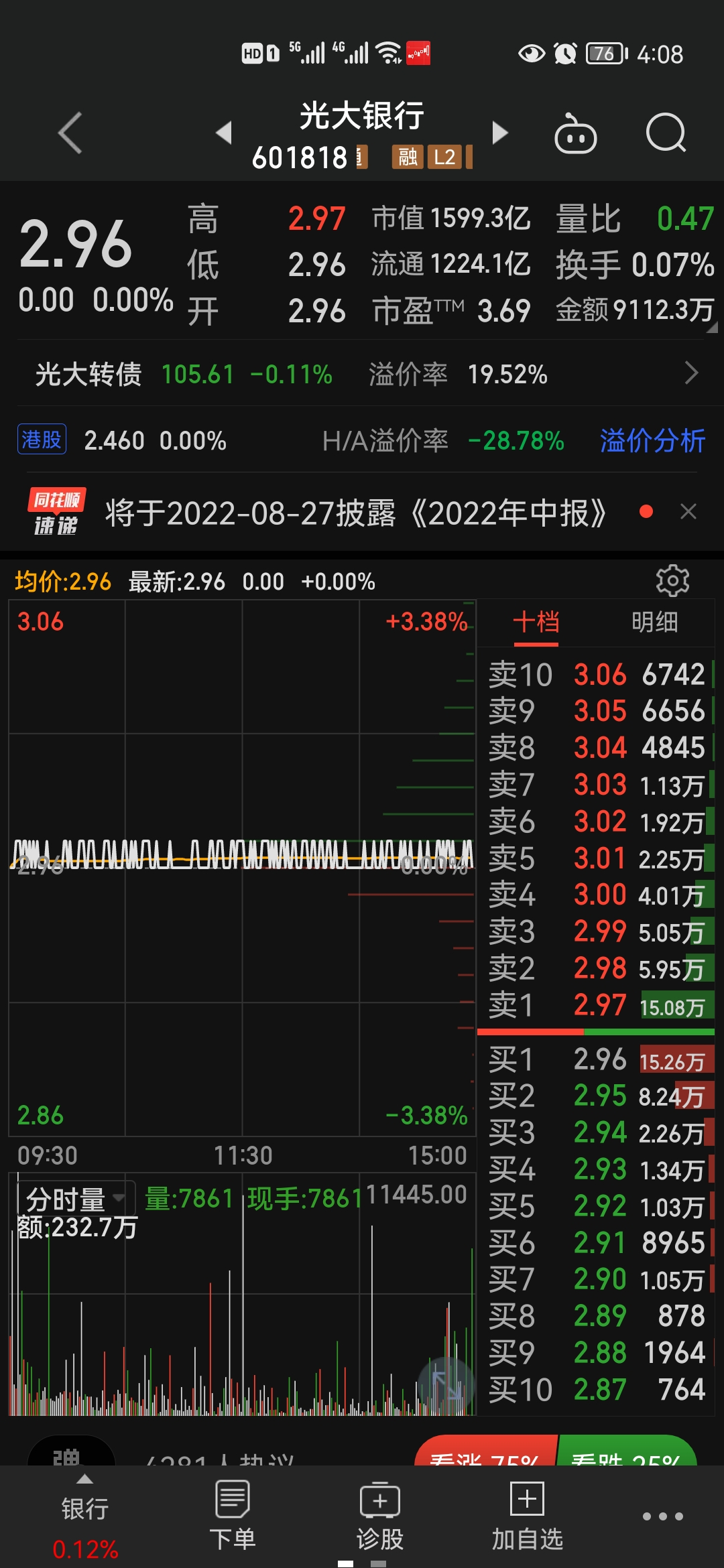 光大银行作为当前的第一重仓肯定是看好的,必须风险不大,需要非常大的耐心。