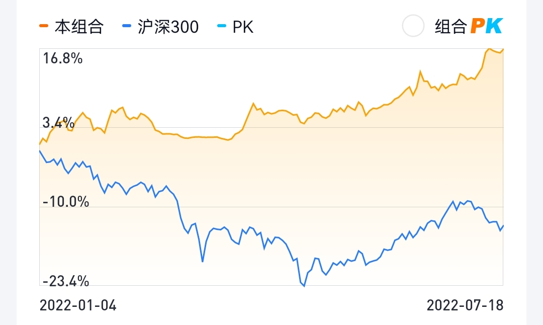 今年沪深300净值0.8731,组合1.1684,领先+29.53%。