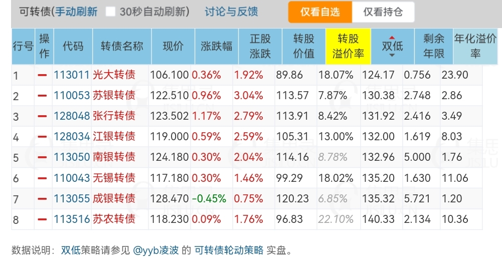 今天显示持有的8只银行正股或转债对应的双低估值如下,平均价格119.897元,平均溢价率12.889%,平均双低值132.785。