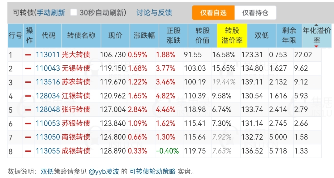 当前持仓4只双低银行转债+4只银行年化溢价率,重新回到年初规划的节奏,继续坚持做低波动率、低风险、低回撤组合。
