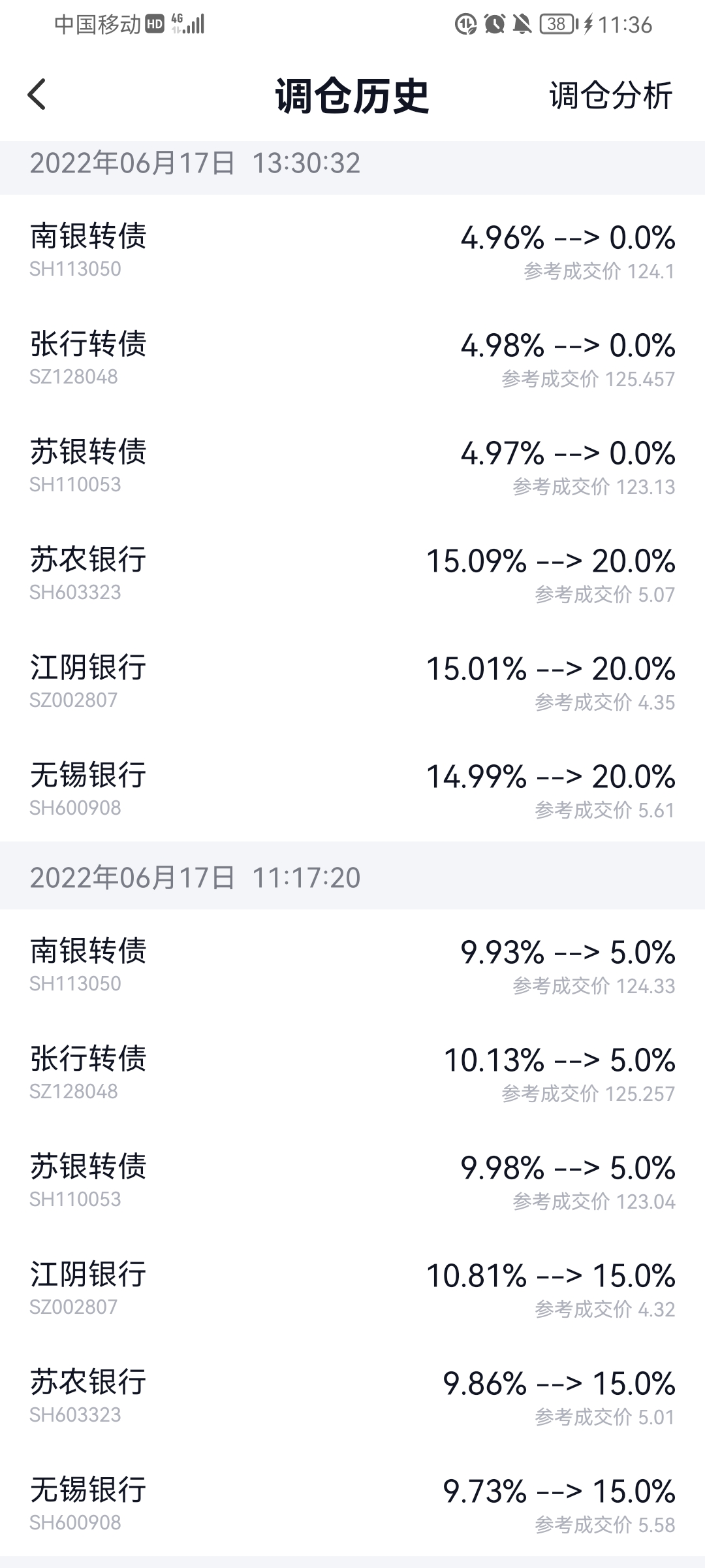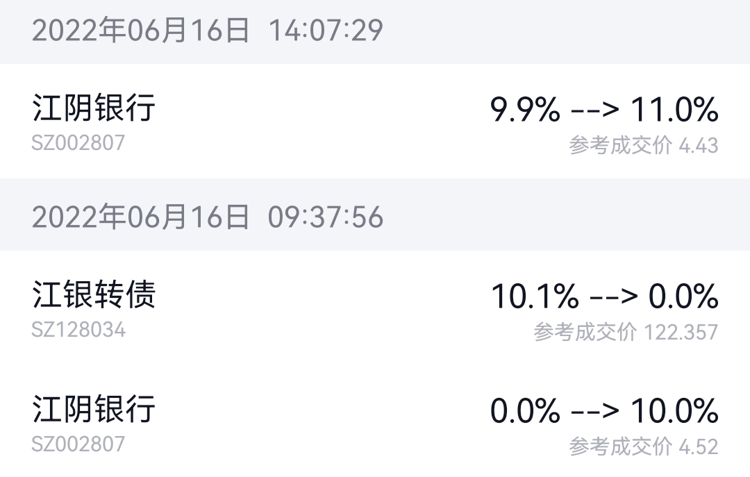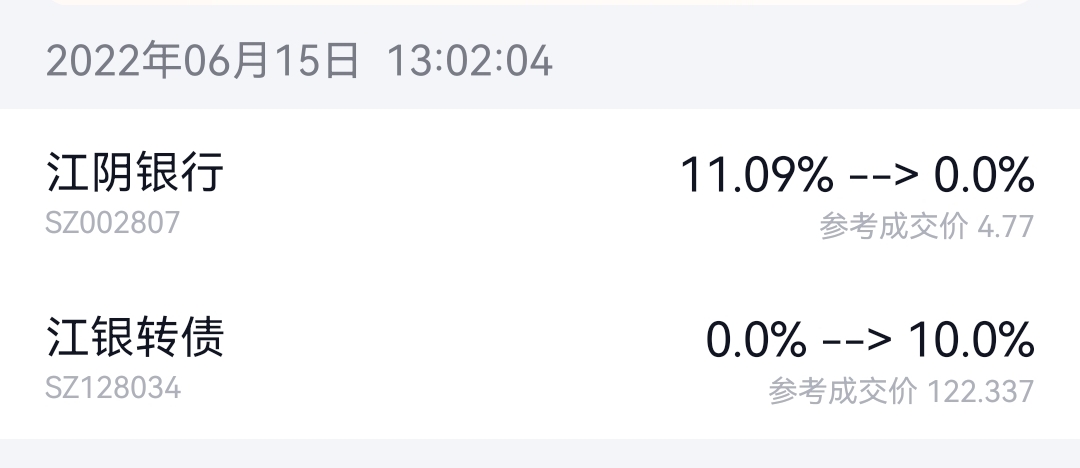 本日操作:按计划江阴银行4.77元切换到江银转债,仓位被动降到98%。