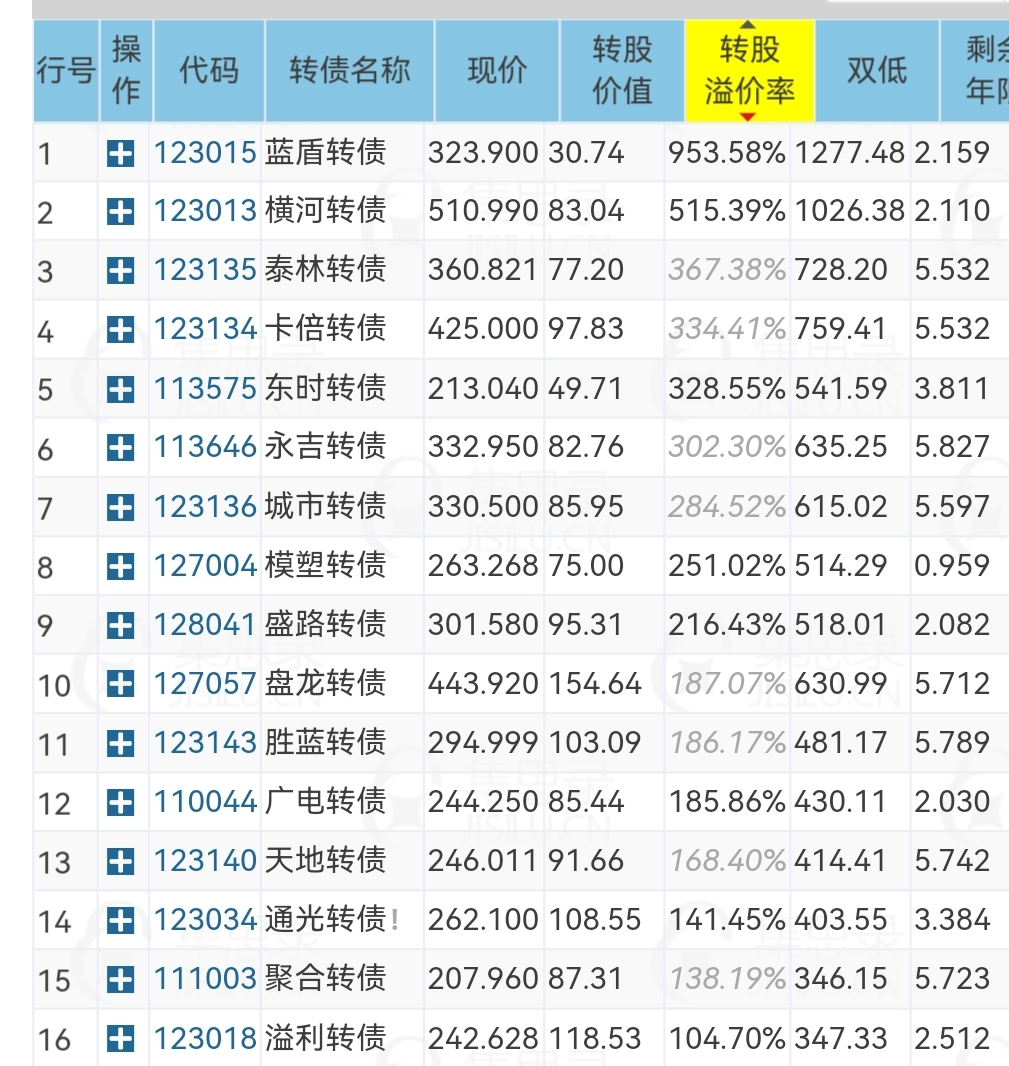 价格200元以上且溢价率200%妖债已达10只,已把之前100%溢价率妖债翻了倍,其中蓝盾转债溢价率超过1000%。到期年限还有2.162年。