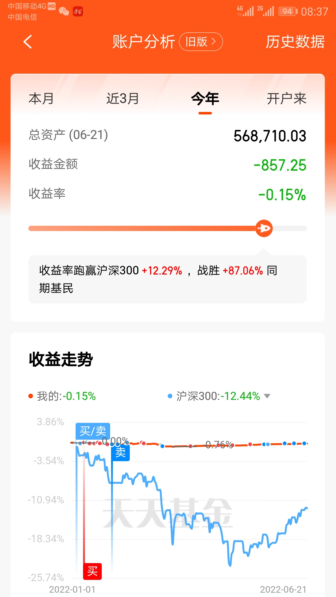 今日市场跌的惨不忍睹,面对这样市场性风险,持仓者亏损不可避免,全天几乎没动,14%仓位亏损-0.37%,年度收益再次转负为:-0.31%,Mark一下,后续暂无加仓计划。