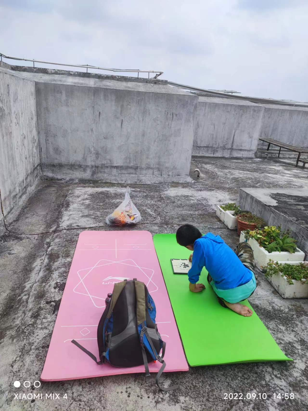封闭期间,我和孔曼且硕常常到无人的楼顶露营观鸟、下棋玩球、聊天阅读、吃喝晒太阳,有时天快黑了都还不想走呢。