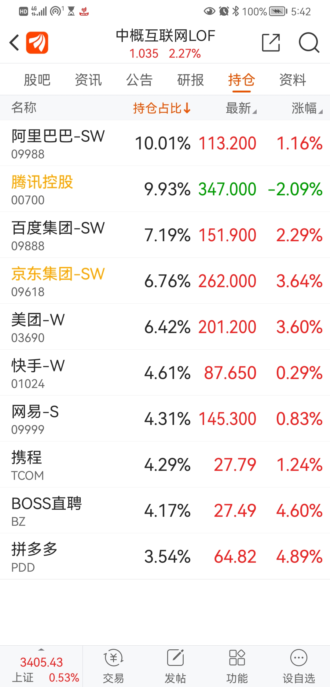 持仓今天涨幅不错,浓眉大眼的腾讯今天涨了5.88%,持仓个股涨幅第二名。腾讯是持仓个股第一大仓位,也带动整体净值大涨。