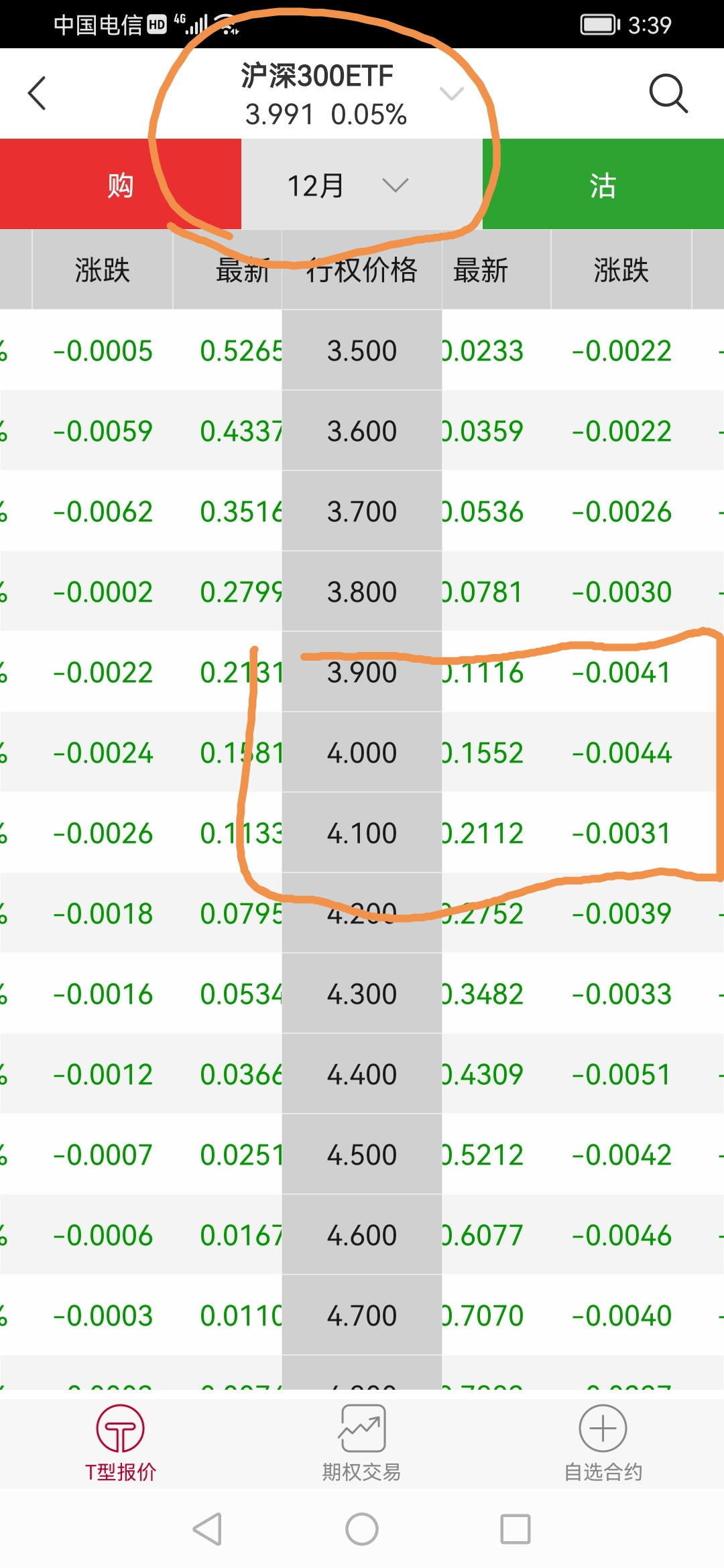 由于股价下跌。3900沽变成平值,溢价最大,那么此刻可以双平!就是说此刻平仓支出0.114元左右。