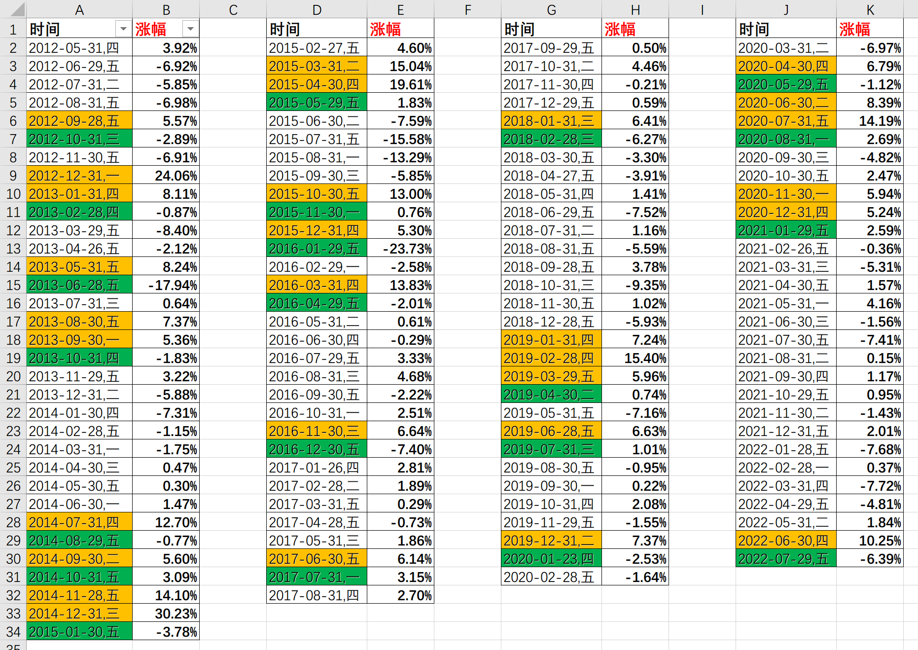 橙色为月涨幅大于5%,绿色为月涨幅小于5%,橙色一共29个月,后面就有29次连续月,其中7次大于5%,那么在确定月涨幅大于5%后,下个月的涨幅再次大于5%的概率为7/29≈24.14%,与23.58%并无显著差异。