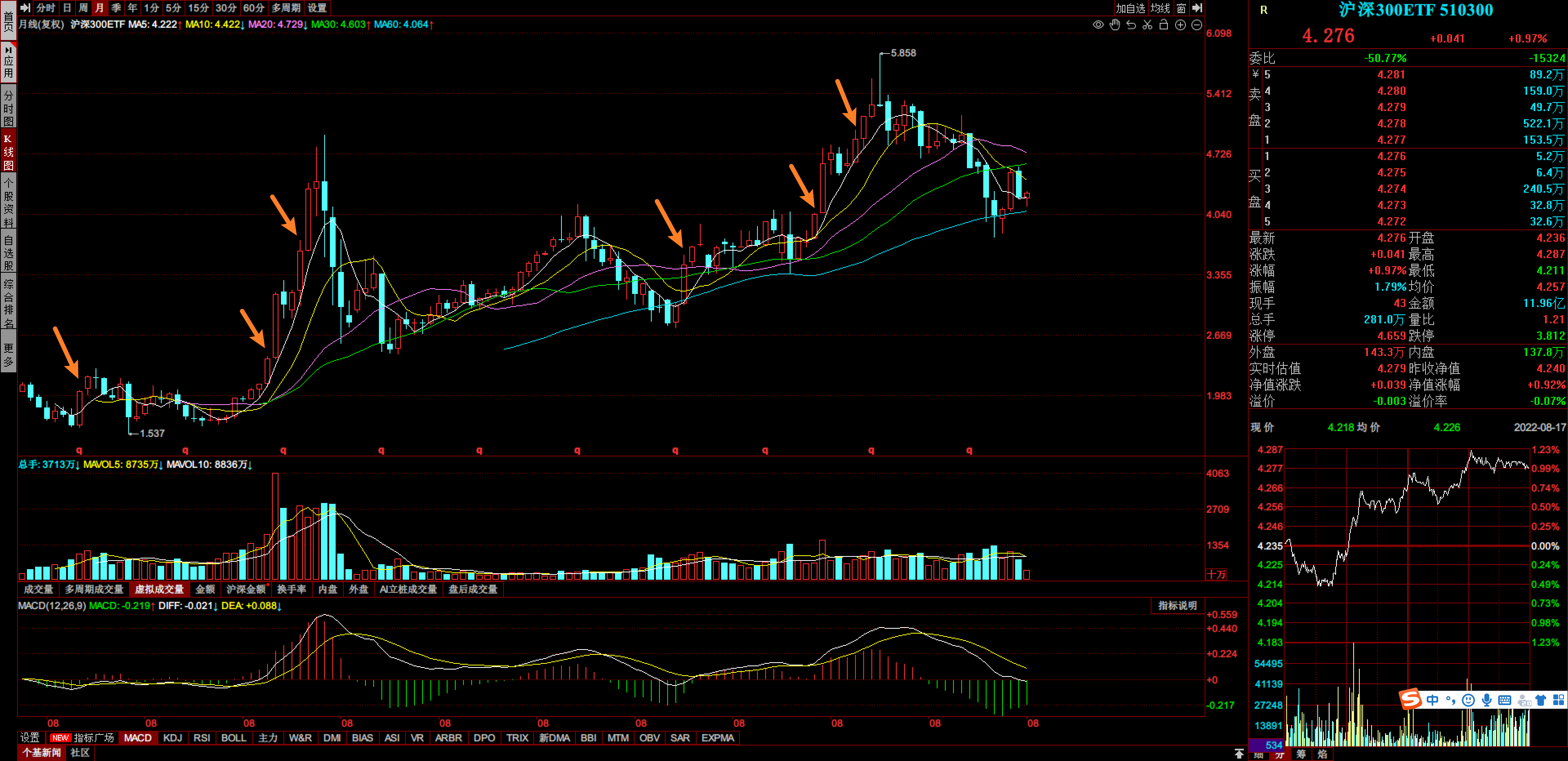按照收盘价计算,300ETF变动-0.04元(4.276-4.236元)