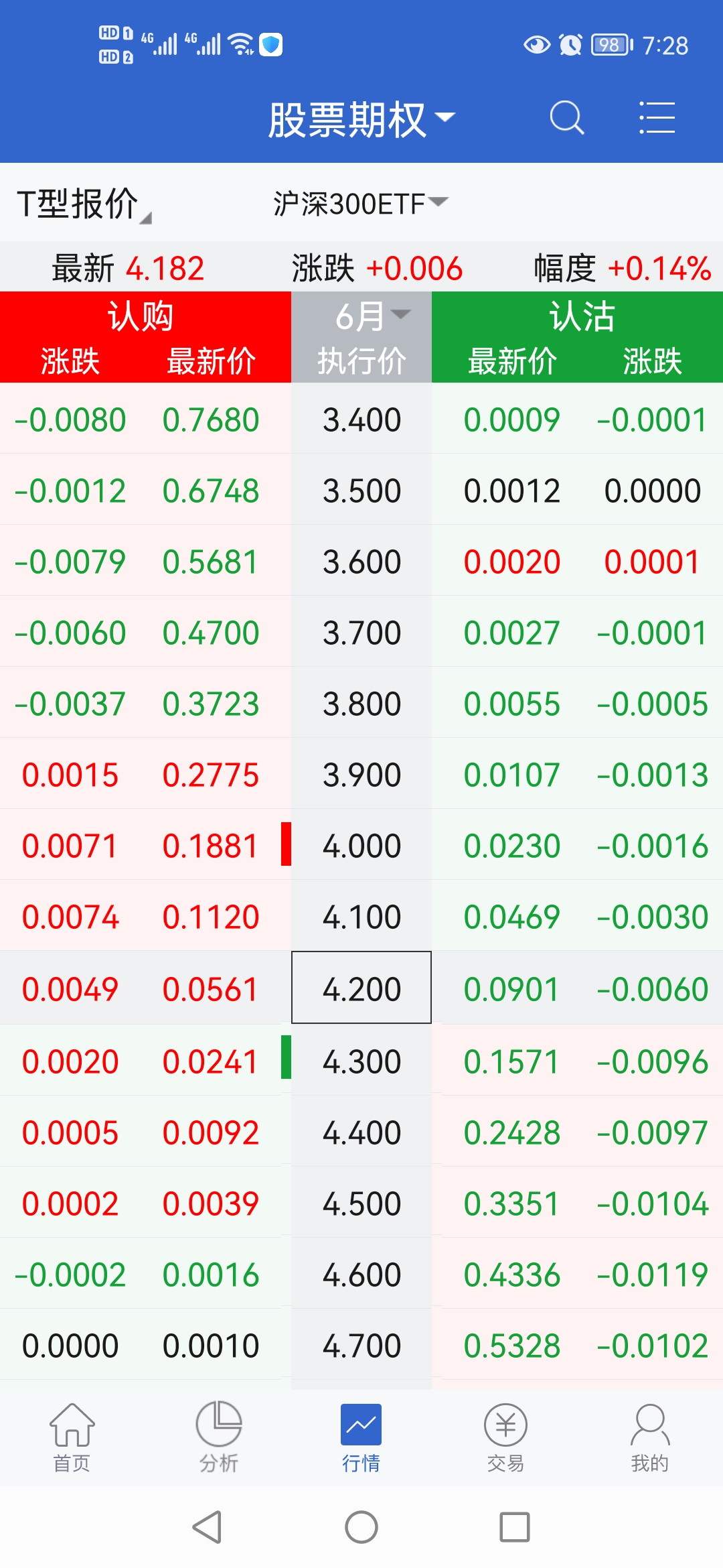 300ETF收盘4.182元,我的对应6月4200沽收盘0.09元。就多头而言,做对了方向也拿住了仓位,但是却难以获得合理收益。就是说,哪怕今天股价达到4.2元,该合约平仓需要支出0.08元(等于4.12元卖出多头)。这就是认沽牛市价差无法克服的弊端。如果等到期,股价早就不知道在哪里了。到期,谁都不知道。说不定到期4.201呢。:)