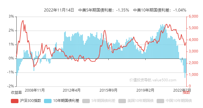 这就是中美利差曲线。由于利差持续扩大(美国升息中国放水)所以指数继续下行探底。