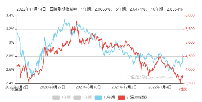 这是019547十年期债券价格走势。在价格高位(收益率低点),我们这里讨论过,这会导致股债性价比偏向股市(300指数)。理论虽如此,实际上300指数继续超跌了大约10%。因此专家们进一步分析认为,中国的股债比无效,必须用美国债券来和300指数比。(这是在默认北水是A股定价权主导者的地位)