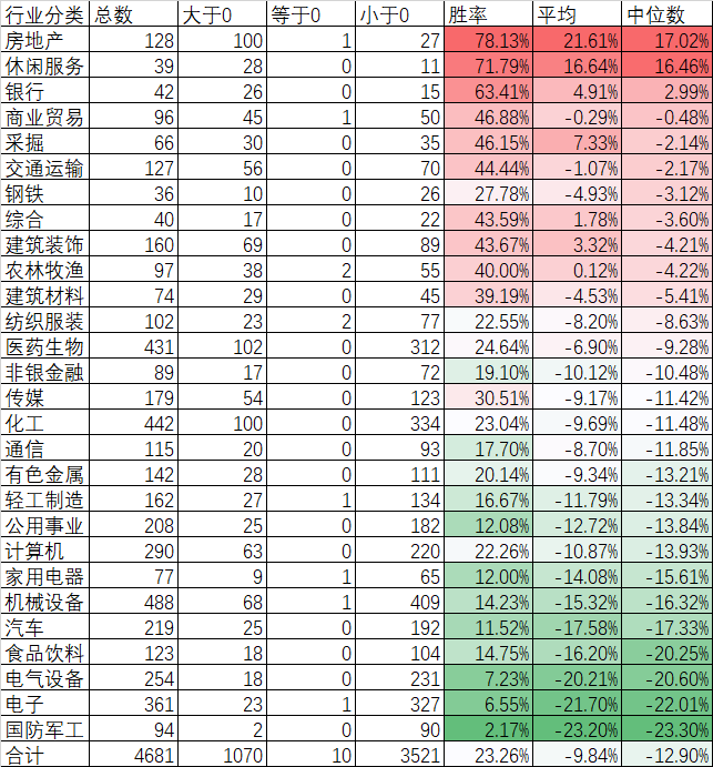 最惨的国防军工行业,92家公司只有2家上涨,90家下跌,胜率才2.17%,平均下跌了23.20%,下跌的中位数也高达23.30%,三项数据全部垫底。最惨的科思科技、中航机电、北摩高科、华讯方舟等,跌幅都超过40%。