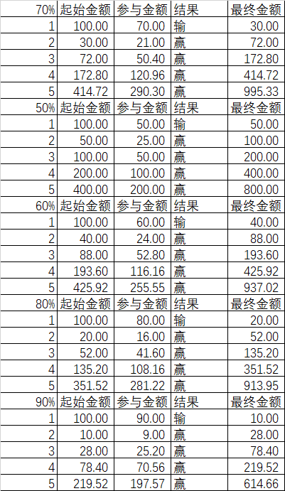 那我们再来看看,如果不是按照凯利公式的70%参与赌局,我们分别计算用50%、60%、80%、90%和70%对比一下,既然上面已经证明了输发生在任何一次对结果都无影响,那么我们统一假定第一次输: