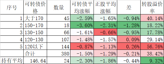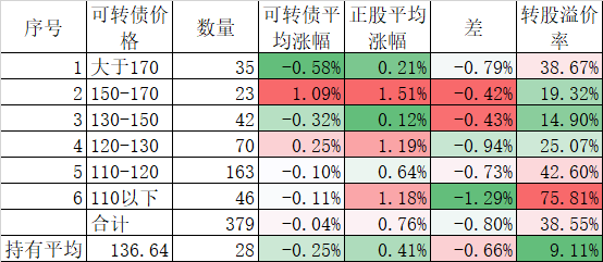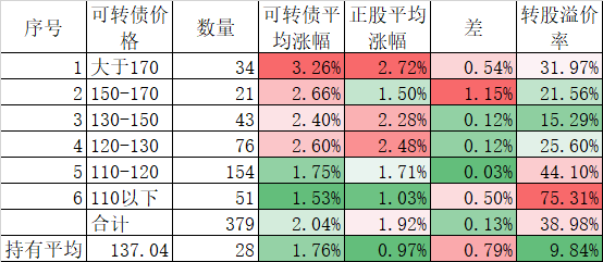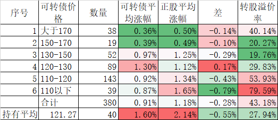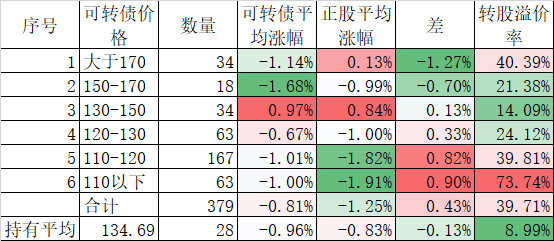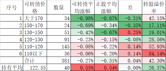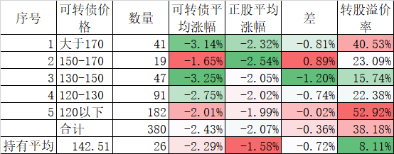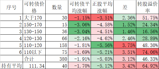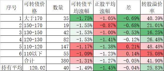 个股表现差于指数,在可转债上也得到反应,今天可转债跌幅虽然和正股差异不大,但平均也下跌了1.31%,我的40只可转债平均更是下跌了1.49%,最终实盘合计下跌了1.40%,是反弹以来跌幅较大的一天了。不过现在持有的可转债价格和溢价率均不高,也没必要慌张。