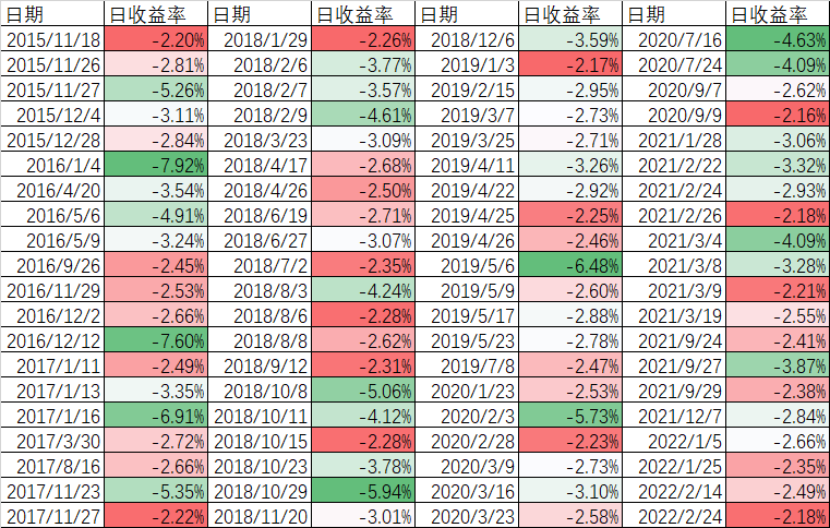 统计完以后也吓我一跳,7年多竟然有80次亏损大于2.16%的。其中2015年5次,2016年8次,2017年7次,2018年21次,2019年13次,2020年10次,2021年12次,2022年4次,加上昨天的一次是5次。