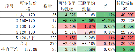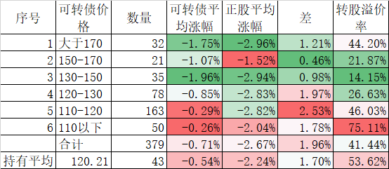 今天可转债成交继续过千亿,可转债平均下跌2.63%,正股平均下跌3.10%,转股溢价率还扩大了。但从分段统计来看,明显看出一个规律,就是高价债的跌幅大于正股,低价债的地方小于正股。除了一部分妖债的转股溢价率居高不下外,其他大部分高价债的溢价率不会很高的,而低价债的溢价率虽然高,但毕竟有债底保护,转股溢价率再要下跌也很难。