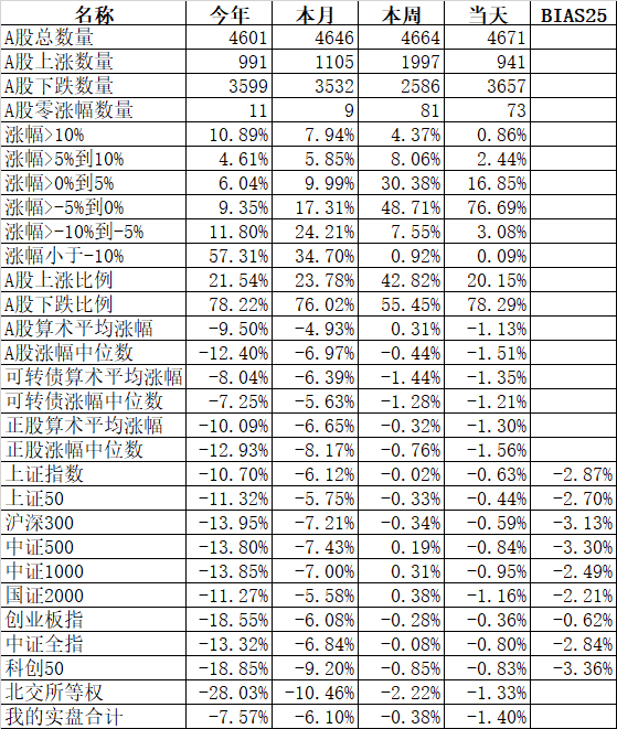 今天市场平开低走,宽基指数中跌幅最大的中证500跌3.45%,跌幅最小的上证50跌1.40%,近90%的个股下跌。工商银行、招商银行、宁德时代、中国平安、中国人寿、比亚迪、美的集团、海康威视、海天味业等1552只股票今天盘中创出今年新低。