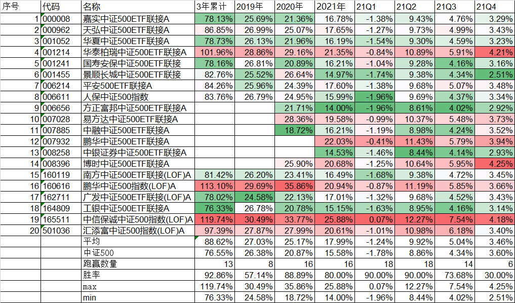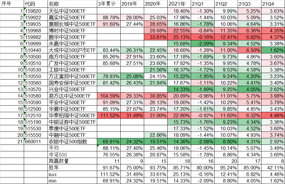 我们再看看21只中证500ETF的情况,相比较增强基金,波动小的多,整体收益率虽然不如增强基金,但在Q4的平均收益率是3.49%,虽然没达到中证500的3.60%,但差异也不大。