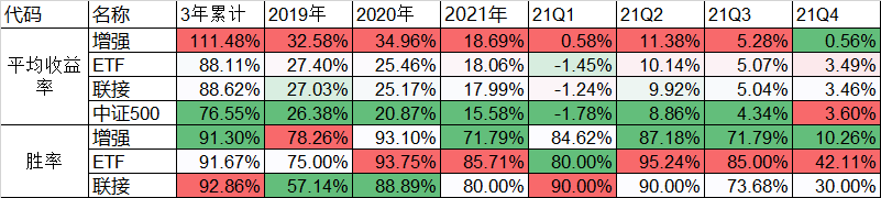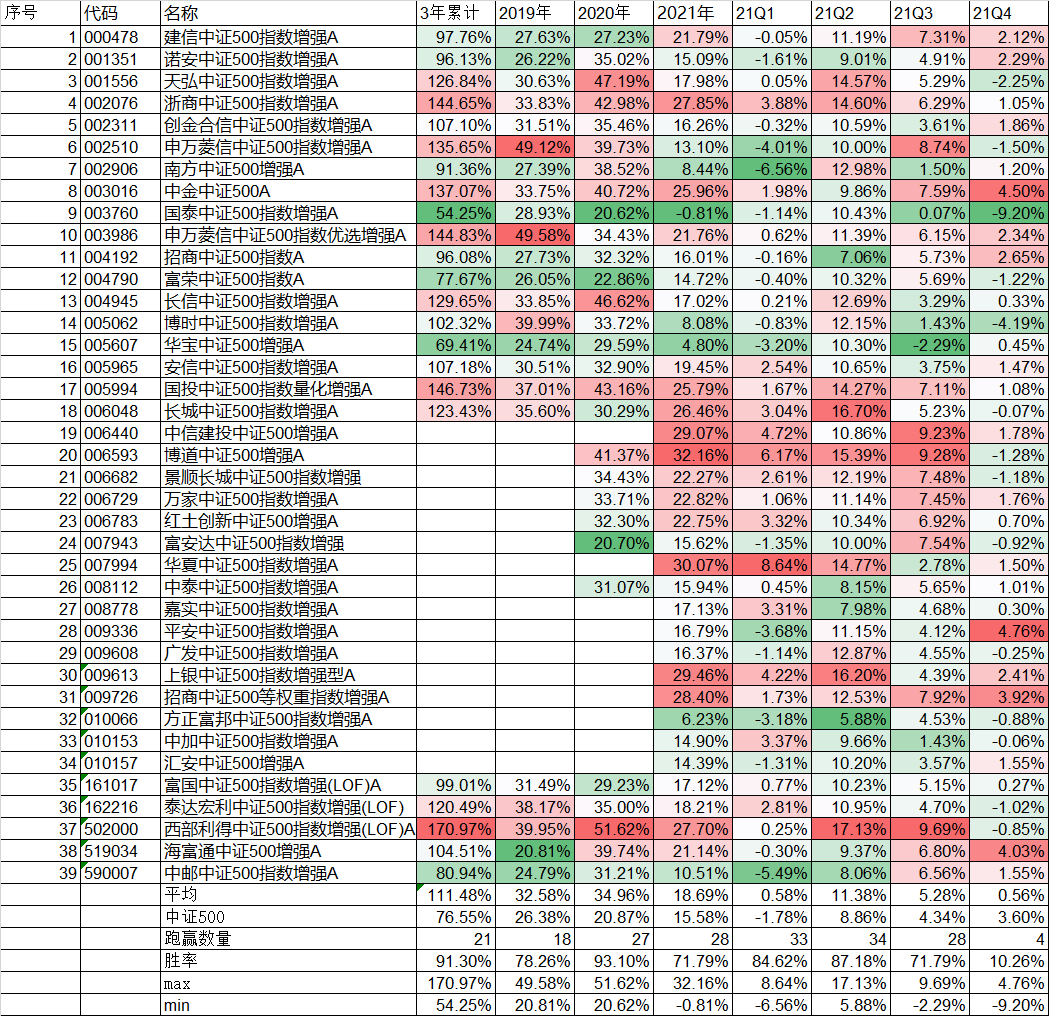 问题是出在最近一个季度,2021年Q4,中证500上证了3.60%,而39只增强基金平均竟然只有上张了1.55%,而且相对中证500指数的胜率竟然只有10.26%,39只增强基金,在Q4跑赢500的只有4只,3年累计表现最出色的西部利得中证500增强,Q4竟然还下跌了0.85%。39只500增强基金,14只不仅没有跑赢中证500指数,还竟然亏损了。如果你在上个季度是看了中证500增强过去的业绩去买的,十有八九很有可能是亏的。