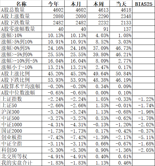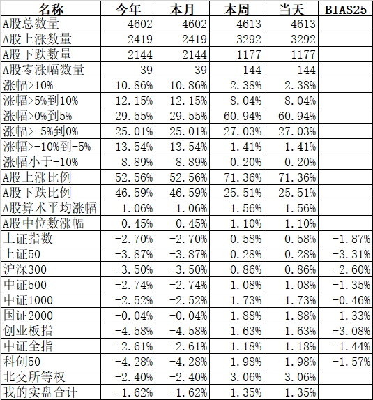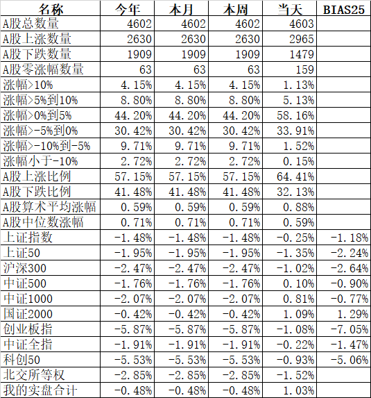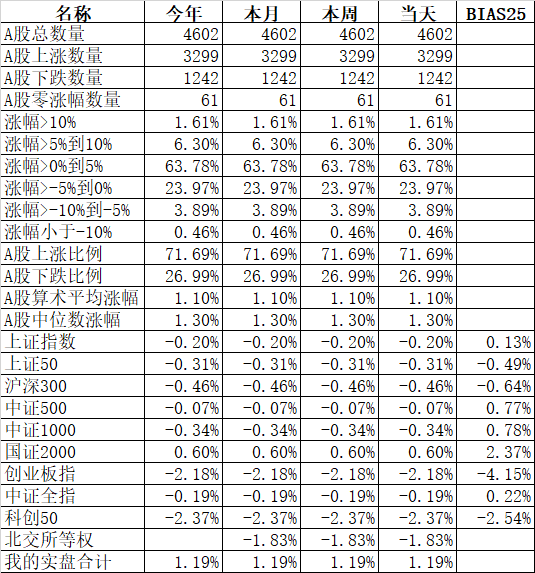 今天其实个股表现非常好,4602只个股中3299只上涨,比例高达71.69%,平均涨幅1.10%,个股涨幅中位数高达1.30%。
