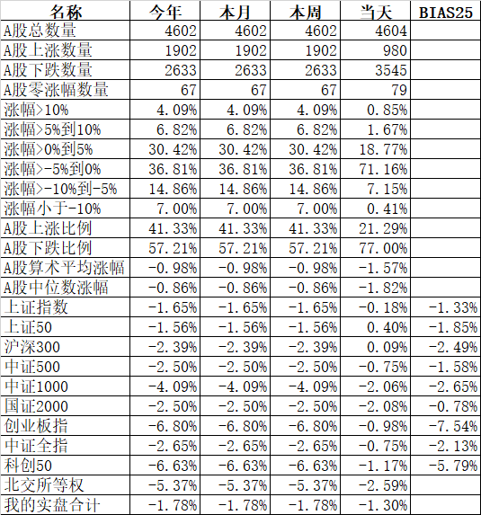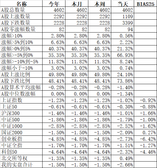 我的可转债今天表现也很差,唯一一个有点盼想的金轮转债,开盘就涨了20%停牌,结果它的正股从涨停一路下滑,在停牌的时候挂了个150元的价格,没想到复牌后就直接开在142元以下,还是我太贪了。今天跌幅最大的两只可转债我都有,钧达转债跌了12.10%、新天转债跌了13.80%。好在上周五在新天冲高的时候以195的平均价格卖了大部分,新天今天的收盘价是183.612元,算是多赚了6.20%,远远超过我回测的每次赚取3%多的阿尔法收益,否则今天亏损还要大。