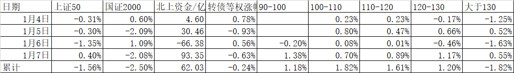 再说说我们小散的操作,今年我的账户4个交易日跌了1.78%,和指数比虽然不算多,但在可转债里也算多的了,按照统计,小于130元价格的可转债今年4个交易日都是正收益,我在雪球上的微辣和不辣组合也是正收益,而大于130元的收益平均是-1.82%,基本上和我的实盘相差不大。