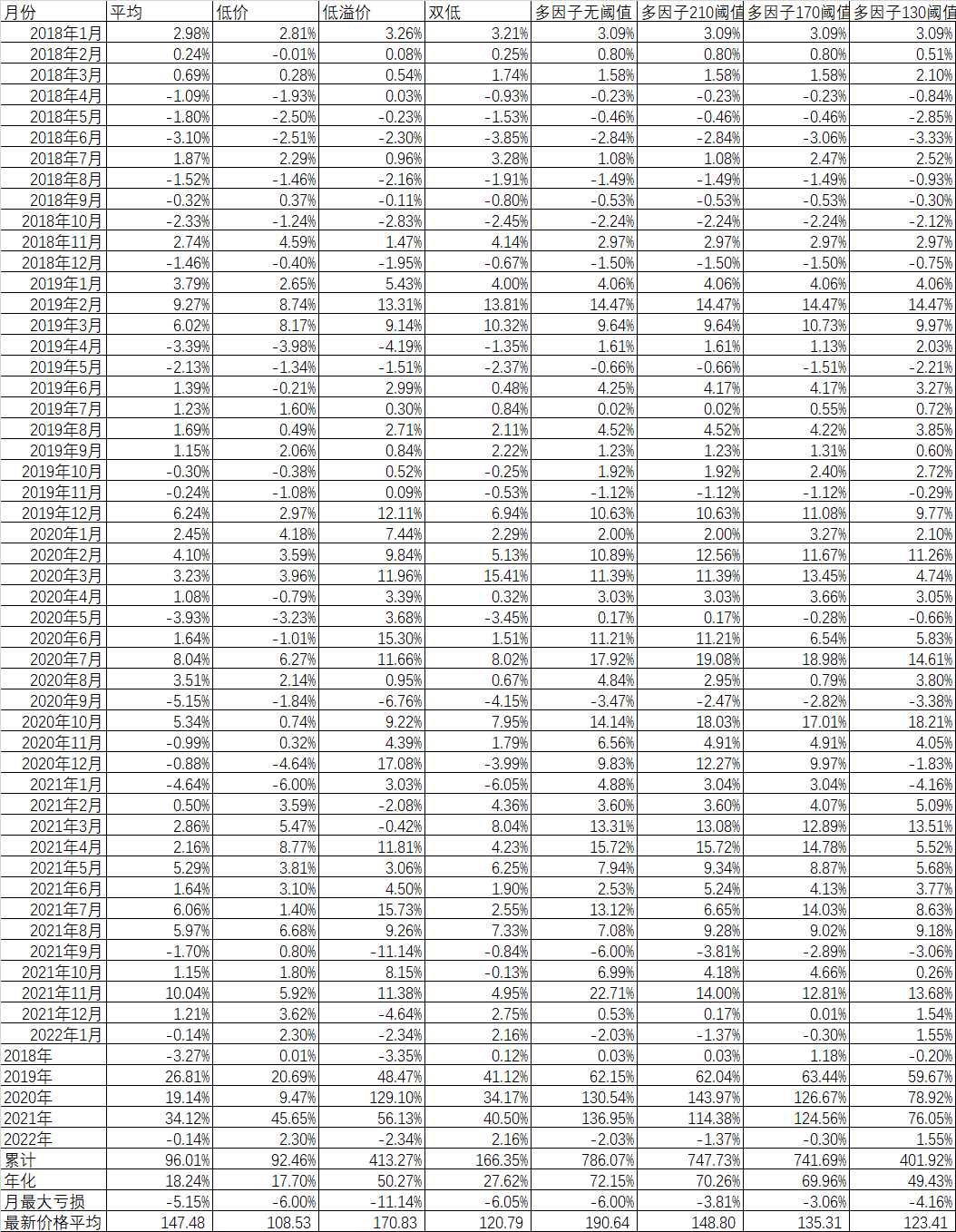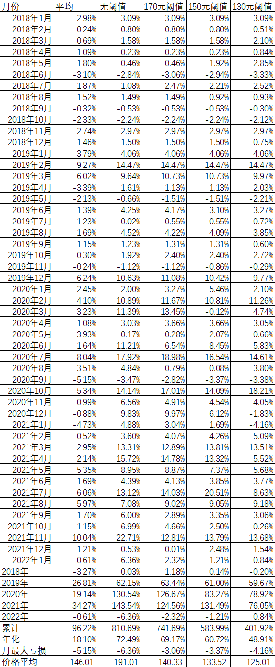 再次回顾一下多因子策略的回测结果,策略是去年6月底完成的,后来半年多的实战基本和回测一致,我们可以很明显的看到最激进的无阈值策略,在整体表现最好的去年11月份,高达22.71%的收益率,同时去年9月和今年1月份都回撤了6%多,而相对比较保守的130元阈值策略,去年9月份亏了3.06%,而今年还有0.84%的盈利。