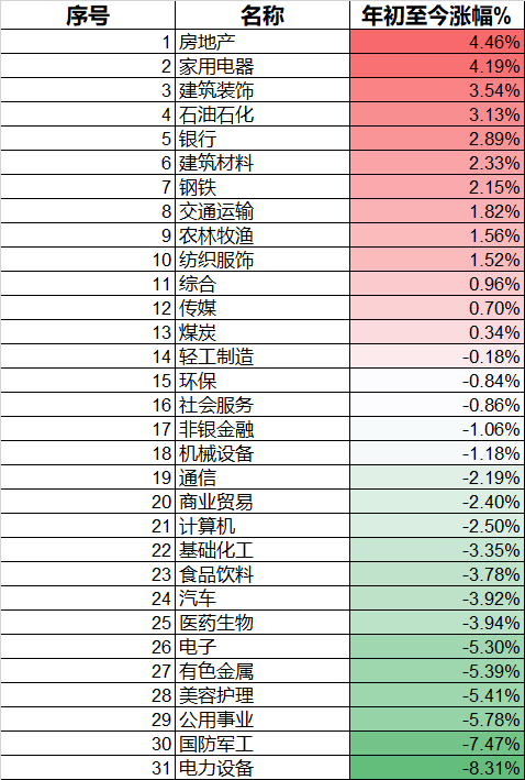 在申万新的31个板块中,今年这4天涨的好的房地产、家用电器、建筑装饰、石油石化、银行等板块都是相对估值比较低的,而跌幅大的电力设备、国防军工等基本都是估值相对高的。这个趋势是否会引领今年全年的走势?现在不敢说,但至少有这个可能。去年炒高的新能源等板块,今年继续走高的可能性不是很大。