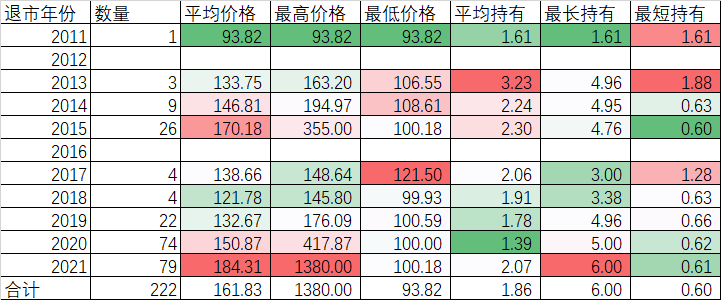 222只退市可转债最后一个交易日的收盘价平均值是161.83元,平均到期时间是1.86年,如果平均买入价格是130元,那么总收益率是161.83/130-1=24.48%,年化收益率是(1+24.48%)^(1/1.86)=12.50%,而从2018年年初开始到现在平均年化收益率大概是19.82%,如果把平均买入价格调低到117元左右,那么差不多接近19.82%这个数字了。