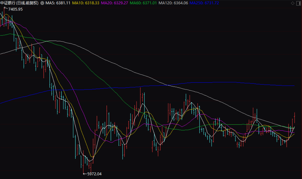 中证银行指数下半年创出5972的阶段性新低后,经过了5次波动,高点越来越低,低点越来越高,收敛在一个狭小的区间内,按照技术派的观点,应该到了选择方向的时候了。最终到底如何还是市场说了算。